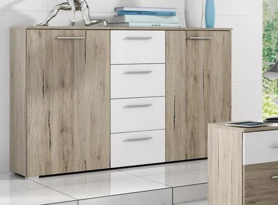 Komoda splňuje dnešní požadavky na funkčnost. Disponuje čtyřmi suplíky a dvěma postranními dveřmi, za který mi se ukrývá police. Zuzana je vyrobená z kvalitního lamina, díky kterému je odolná vůči poškrábání, oděrům, blednutí a krátkodobému působení vody.