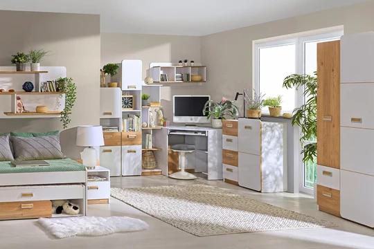 Funkční postel Lorento L16 je ideální do dětského pokoje a pokoje pro teenagery. Nábytek spojuje rysy minimalistického a skandinávského stylu. Neutrální barva je vhodná jak pro holky tak i chlapce.