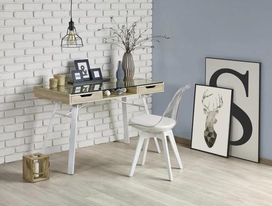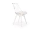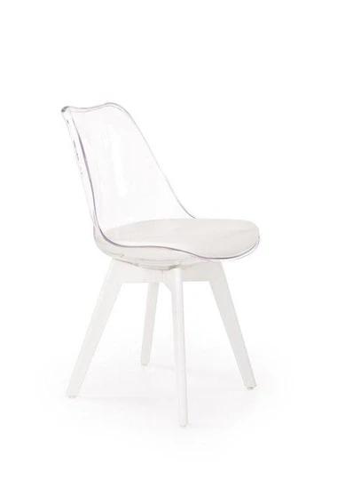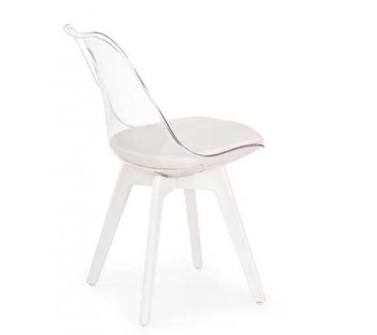 Designová židle vyrobená v bílé/průhledné barvě. Sedák je čalouněný eko kůží.