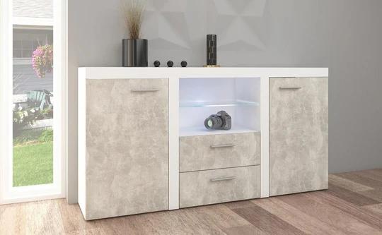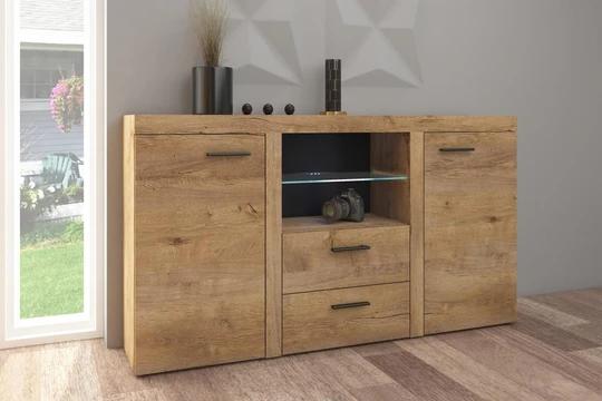 Vytříbená elegance a moderní styl. To je praktická komoda RUMBA, která svým designem dokonale obohatí váš interiér. Je vhodná do obývacího pokoje, ložnice i pracovny. Disponuje dvěmi skříňkami, dvěmi zásuvkami a jednou skleněnou poličkou. Pro podtrhnutí elegance můžete do komody dokoupit i LED osvětlení.