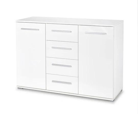 Systém nábytku River je vyrobený z laminované desky v kombinaci s vysokým leskem. U čistě bílého dekoru je nábytek vykonán v bílém lesku. Hrany jsou opatřeny ABS.
