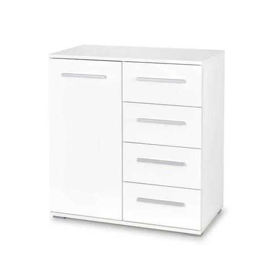 Moderní komoda KM-2 z nábytkové kolekce RIVER ve třech atraktivních dekorech - dub sonoma, dub sonoma/bílá a bílá.