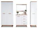 Komplet nabízí úložné prostory pro oblečení i boty. Skládá se z kvalitní dvoudveřové a jednodveřové skříně z masivního dřeva, díky kterým už nebudete muset přemýšlet, kam pověsit bundy. Své využití najdou určitě i komoda a zrcadlo, které podtrhne jemnost a spolehlivě projasní i tu nejtmavší předsíň.