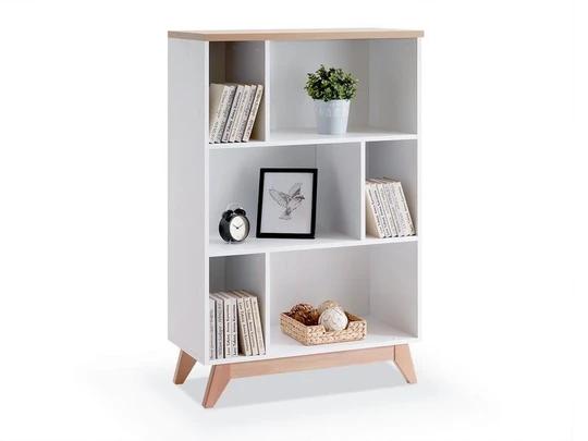 Regál má asymetrické police. Je vyroben z kvalitní laminované desky LTD, díky kterému je odolná vůči poškrábání, oděrům, blednutí a krátkodobému působení vody. Je opatřen také hranou ABS, která zabraňuje možnému poškození. Vysoké nožky regálu jsou vyrobeny z masivního dřeva.