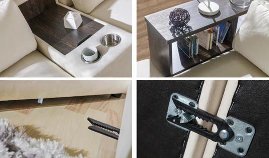 V základní verzi je součástí sedačky malá boční knihovna a odkládací prostor na způsob konferenčního stolku.