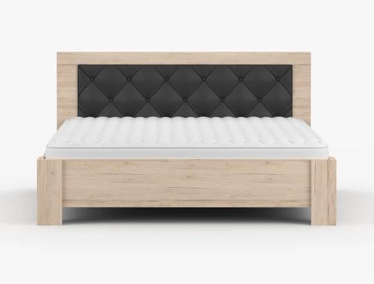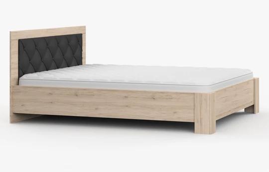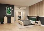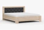 Součástí ložnice je také manželská postel s ložnou plochou 160 × 200 cm, která poskytuje komfortní zázemí pro kvalitní spánek. Dekorativní čalouněné čelo postele zvyšuje pohodlí při relaxaci a zároveň podtrhuje moderní vzhled celé sestavy.