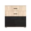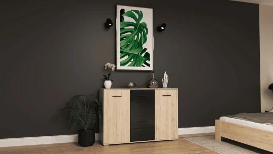 Sestava do ložnice Libera představuje stylové a praktické řešení pro moderně zařízený interiér. Elegantní kombinace dekoru světlého dubu San Remo s kontrastními černými prvky dodává sestavě výrazný charakter a zároveň vytváří útulnou atmosféru ideální pro každodenní odpočinek.