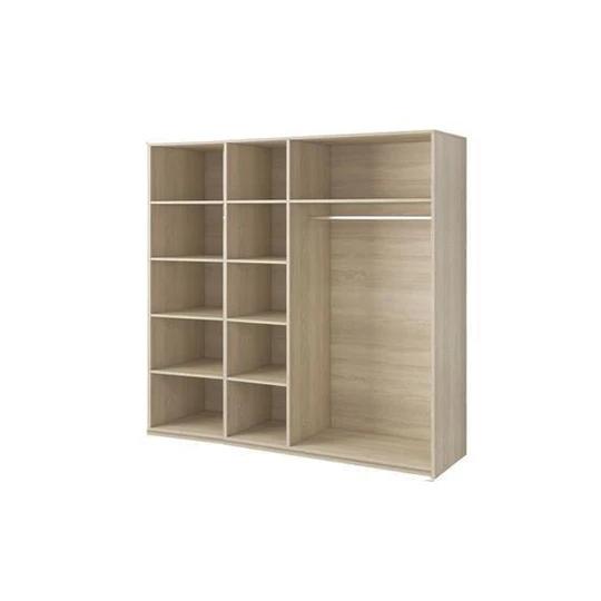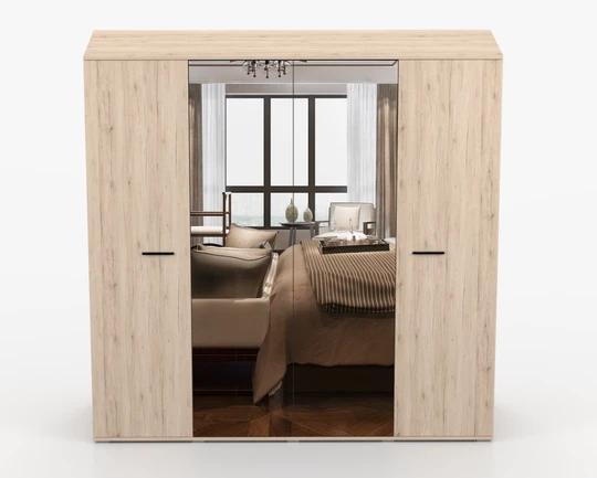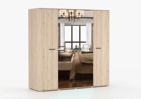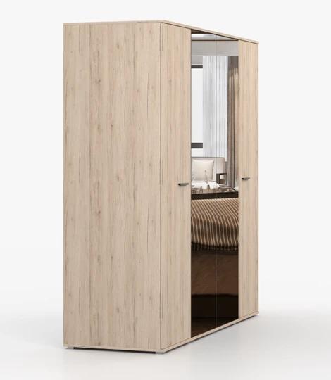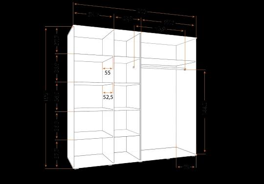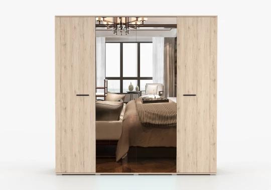 Dominantou sestavy je prostorná šatní skříň se zrcadlem, která díky své velké kapacitě nabízí dostatek místa pro přehledné uložení oblečení. Uvnitř se nachází hluboké police i šatní tyč na ramínka, což umožňuje snadnou organizaci. Praktický systém posuvných dveří šetří místo v místnosti a zajišťuje pohodlné používání. Zrcadlová plocha navíc opticky zvětšuje prostor a prosvětluje interiér.