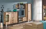 Sestava na obrázku se skládá z: R7 KOMODA (pravá strana) + R3 TV STOLEK (levá strana) + R13 POLICE + R17 SKŘÍŇ (pravá strana)