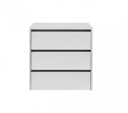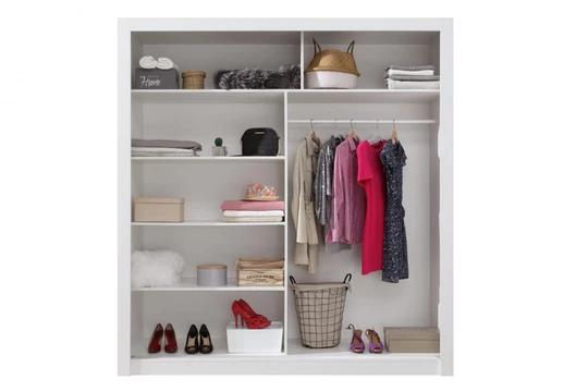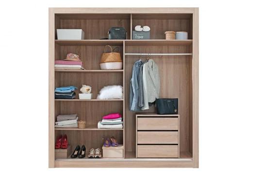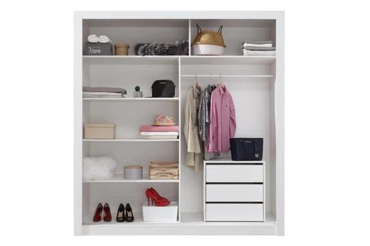 Skříň je vybavena posuvnými dveřmi, které umožňují snadné otevírání i v menších prostorech. Pro ještě lepší organizaci je možné do skříně zakoupit doplňkový kontejner se třemi zásuvkami, který poskytne extra úložný prostor na drobnosti a doplňky.