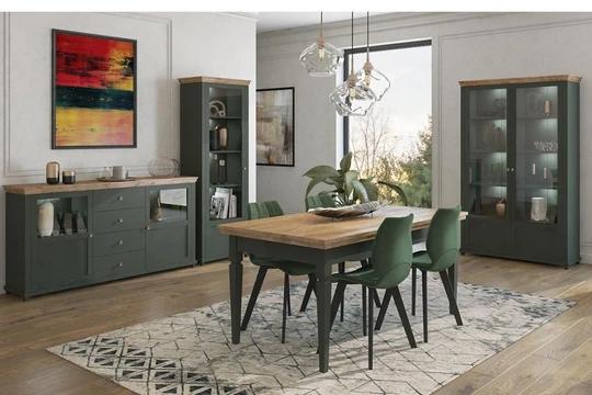 Nábytek ze systému Rennes se vyznačuje klasickým designem, který zapadne do každého interieru. Kombinace tmavé zelené barvy se světlým dřevem jí dodává na eleganci.
