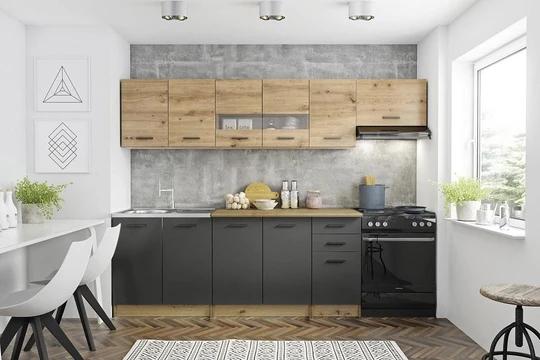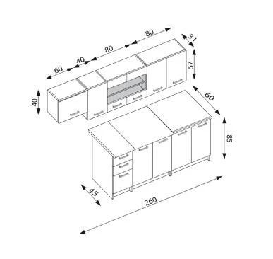 Je složena z několika druhů skříněk, díky kterým budete mít dostatek úložného prostoru na všechny kuchyňské potřeby. Se svými rozměry perfektně zapadne i do menších interiérů. Pracovní deska má hrubost 28 mm. Váha kuchyně je 126 kg.