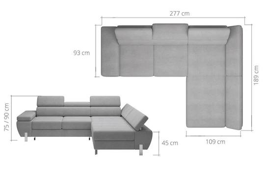 Moderní sedací souprava s funkcí rozkladu a možností následného spánku o ploše 141x217 cm. Součástí sedačky je i úložný prostor, regulovatelné záhlavníky a opěrka loktů.