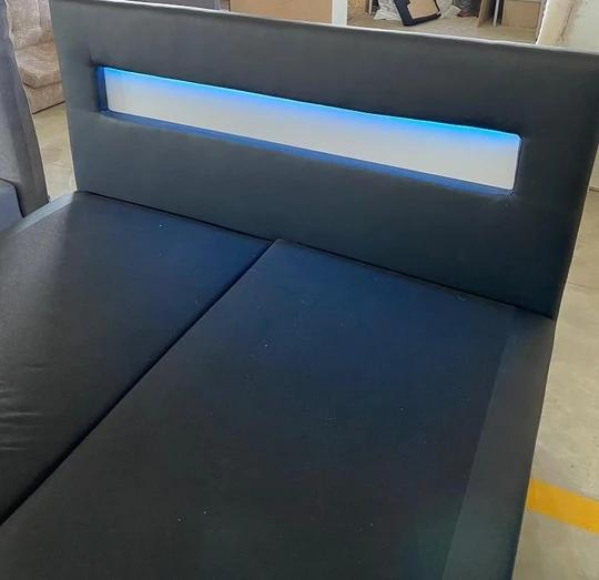 Boxspring postel Malone 200x200 cm Vás zaujme nejen svým minimalistickým designem, ale hlavně neotřelým umístěním moderního barevného led osvětlení v čele postele na dálkové ovládání.