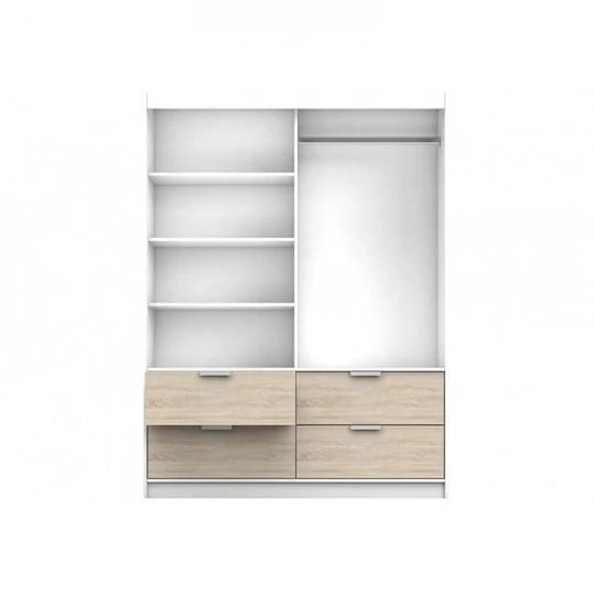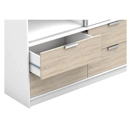 Margita je moderní skříň s posuvnými dveřmi. Svým designem a neutrálním dekorem se hodí takřka do každého interieru. Díky posuvným dveřím vám skříň nezabírá místo navíc. Skříň je rozdělena na dvě části, vybavena několika policemi, šatní tyčí a ve spodní části 4 prostornými šuplíky. Zrcadlo vám pomůže vychytat poslední detaily při oblékání.