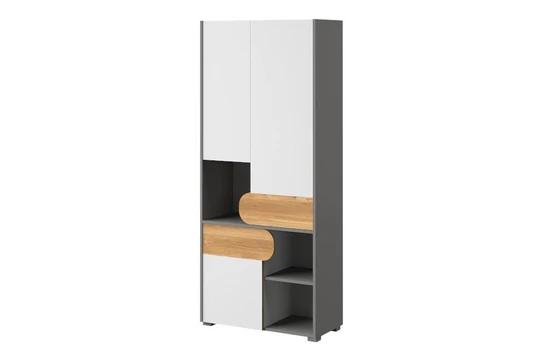 Nábytku dominuje šedý korpus doplněný ve předu bílým dekorem v kombinaci s hřžejivým dřevem dubu.