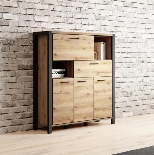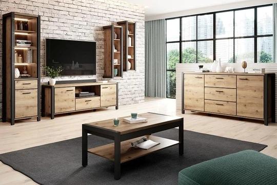 Minimalistická obývací sestava ELBE v industriálním designu. Nábytek z tohoto programu byl navržen tak, aby byl moderní, funkční a designový.