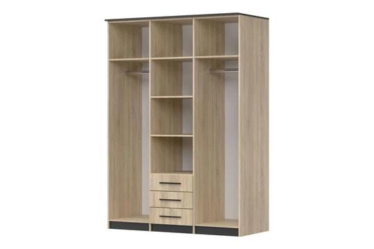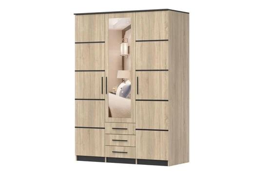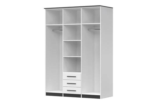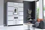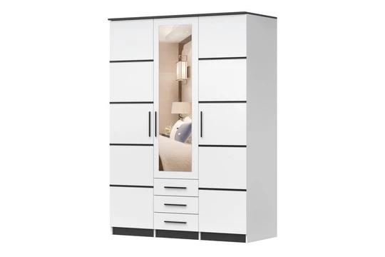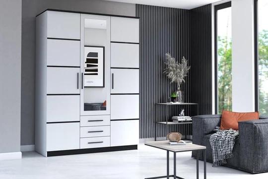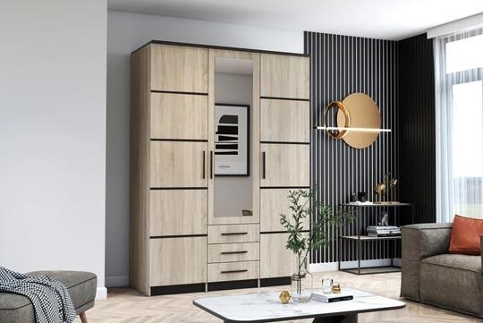 Skříň je rozdělena na tři části, vybavena několika policemi, šatní tyčí a šuplíky. Zrcadlo vám pomůže vychytat poslední detaily při oblékání.