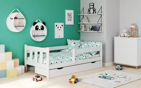 Bílá dětská postel s úložným prostorem vyrobená z masivního lakovaného borovicového dřeva se zaoblenými hranami. Ve výbavě nechybí ani zábrana, díky které dítě při nočním cestování nevypadne z postele. Zábradlí lze namontovat na obě strany postele.