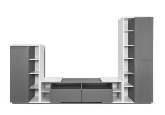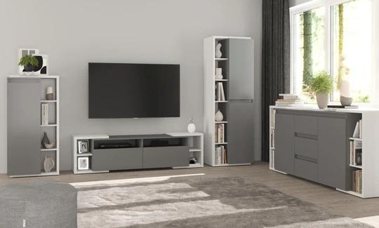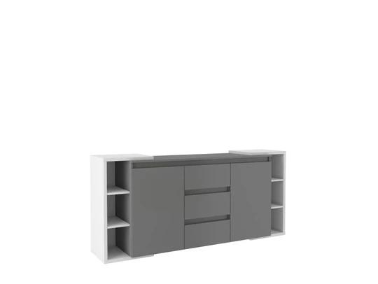 Přední desky jednotlivých kusů nábytku ze sestavy jsou vyrobeny z laminované desky o tloušťce 16 mm v barvě antracitu s ABS hranami o tloušťce 1mm. Korpus skříněk tvoří laminovaná deska o tloušťce 22 mm ve světle šedé barvě s ABS hranami 1mm v kombinaci s laminovanou desku o tloušťce 16 mm ve světle šedé/antracit barvě s ABS hranami 1 mm. Všechny skříňky mají stříbrné plastové nožky o výšce 10mm.