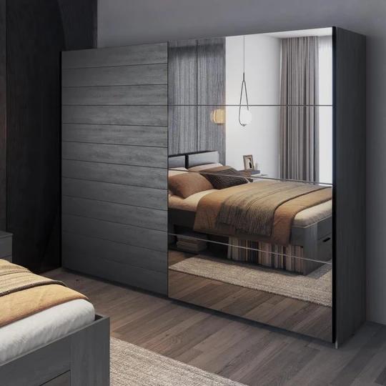 Sestava nabízí výběr ze tří rozměrů postele a tří rozměrů posuvné šatní skříně. Postel o rozměrech 140x200, 160x200 a 180x200. Šatní škříň o šířce 200 cm, 221 cm a pořádná 270 cm.