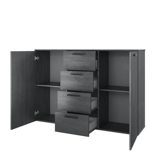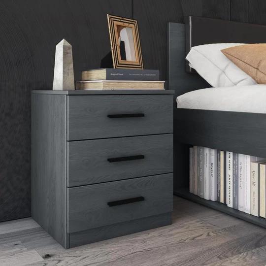 Komoda má dvoje dvířka a 4 šuplíky. Klasický noční stolek disponuje 3 zásuvkami.