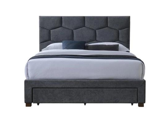 Dřevený rám postele je potažený sametovou šedou látkou a její součástí je laťkový rošt. Doporučujeme zakoupit matraci Polaris.