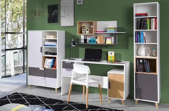 Sestava obsahuje skříň, regál. Nechybí ani police a dokonce zde najdete i psací stůl se skříňkou. Nábytek nabízí štědrý úložný prostor, který pojme jak učebnice, tak osobní poklady.
