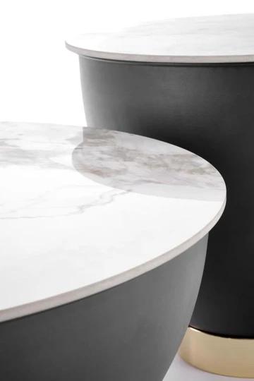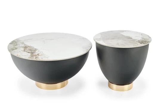 Horní deska je vyrobena z odolné keramiky s efektem bílého mramoru, který působí luxusně a nadčasově. Konstrukce z práškově lakované oceli v kombinaci zlaté a jasanové barvy dodává celku jemný kontrast i pevnost. Právě tato kombinace vytváří harmonický vzhled, který zaujme na první pohled.