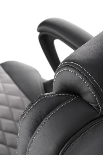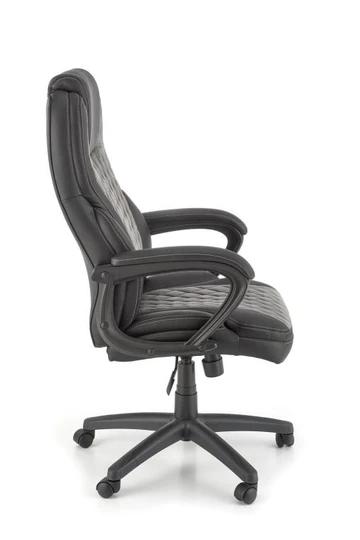 Materiál kombinuje látku a eko kůži, což zaručuje dlouhou životnost a komfortní pocit při sezení. Jedinečná kombinace barvy černá - šedá přidává elegantní a moderní vzhled, který se skvěle hodí do každé kanceláře.