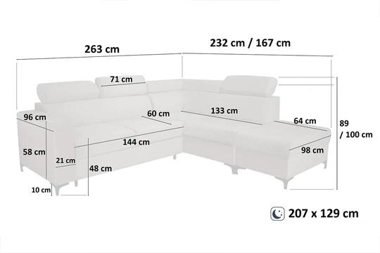 Rohová sedačka NEMO kombinuje moderní design s funkčností, což ji činí ideální volbou pro každý stylový interiér. Sedačka je vybavena polohovacími záhlavníky pro maximální komfort a elegantními černými nožkami, které dodávají sofistikovaný vzhled. Díky rozkládacímu mechanismu nabízí praktickou funkci spaní a úložný prostor pro lůžkoviny nebo jiné potřeby.