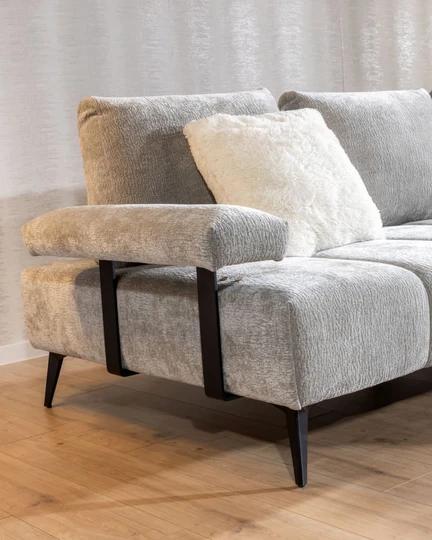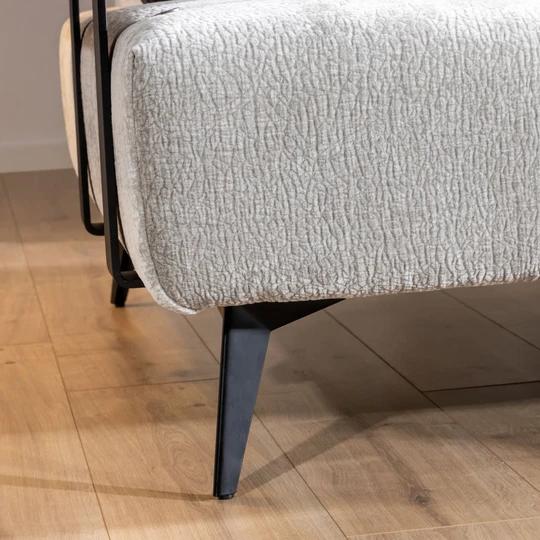 Kvalitní výplň sedáku zahrnuje pěnu T 35 kg/m³, čalounické popruhy a pružiny faliste, což zajišťuje optimální komfort. Opěrací polštáře jsou plněné silikonem pro maximální měkkost. Sedačka stojí na vysokých černých kovových nožkách, které přidávají na její moderní eleganci.