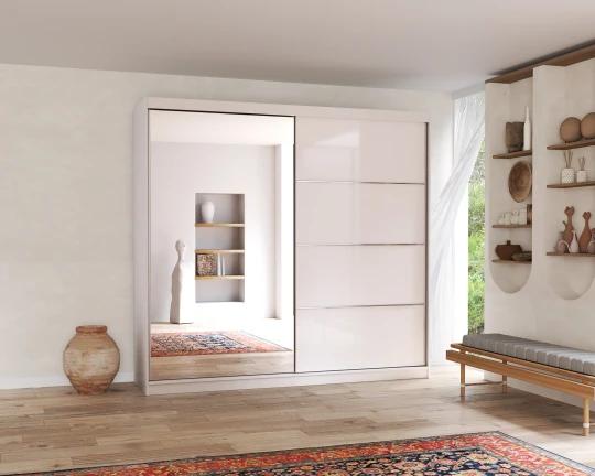 Velká posuvná skříň disponuje štědrým úložným prostorem, který ocení především poctivě nakupující ženy. Uvnitř se nachází několik praktických polic a šatní tyčZrcadlo vám pomůže vychytat poslední detaily při oblékání.