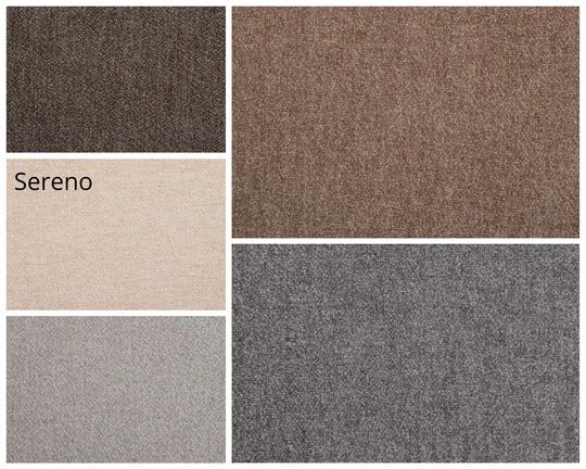 SERENO - látka kombinuje jemnost na dotek s nekompromisní pevností. Sereno patří mezi tkaniny, které mohou vykazovat jemné stínování nebo odlesky. Díky složení ze 100% polyesteru a vysoké gramáži 290 g/m² je látka mimořádně odolná proti roztržení a tahu (kategorie A). Látka prošla cigaretovým testem, což zvyšuje bezpečnost v domácnosti. V testu odolnosti vůči oděru Martindale dosahuje 80 000 cyklů.