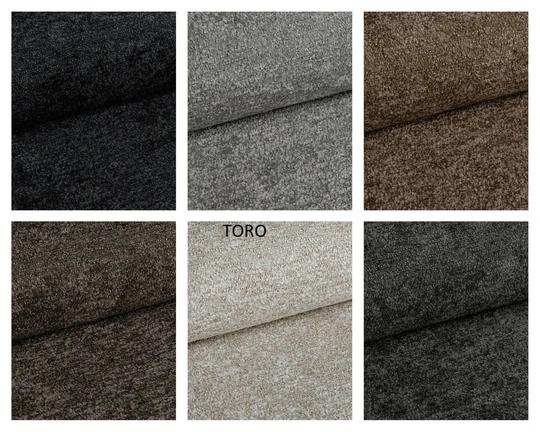 TORO je látka kombinující bouclé a chenillovou přízi. Flexibilní, univerzální a elegantní. Složením se jedná o 100% polyester, vysoká gramáž 400 g/m². V testu odolnosti vůči oděru dosahuje 80 000 cyklů, což ji řadí mezi odolné látky. Nehořlavá.